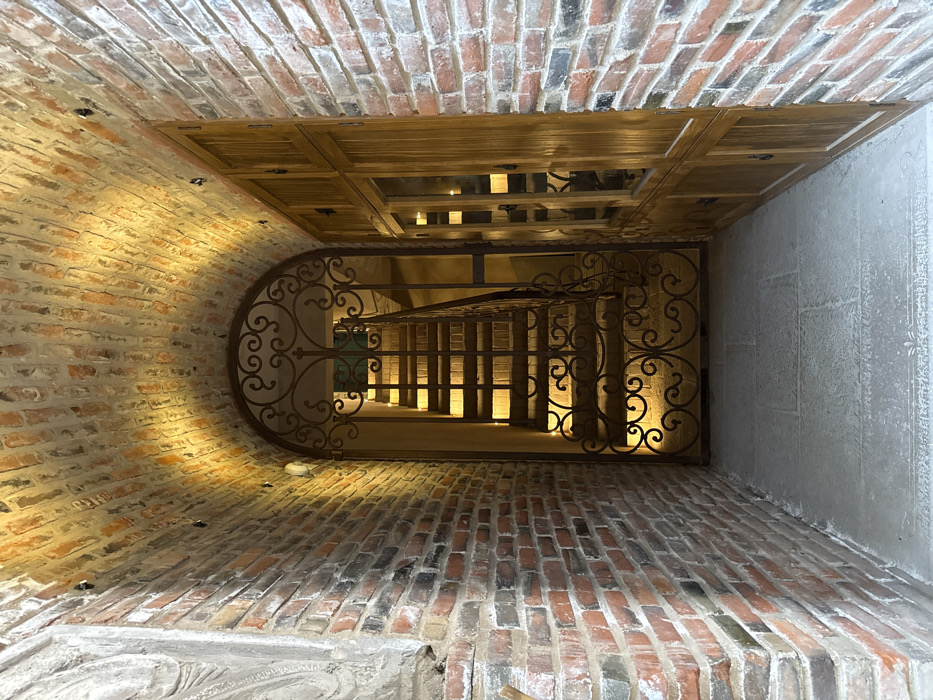 An eye-level view into a brick-walled tunnel, illuminated by warm, yellow lighting. A decorative wrought-iron gate partially obscures a wine cellar or display area with evenly spaced, illuminated wine racks. The tunnel's ceiling features wooden panels, contrasting with the textured brick walls. A smooth, gray wall occupies the right side of the frame. The perspective gives a sense of depth, highlighting the tunnel's architectural design and warm ambiance.
