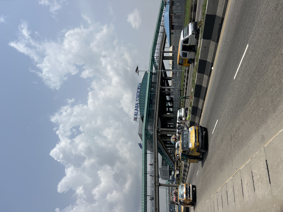 This image depicts a busy road scene featuring the Alaba Station in Lagos, Nigeria