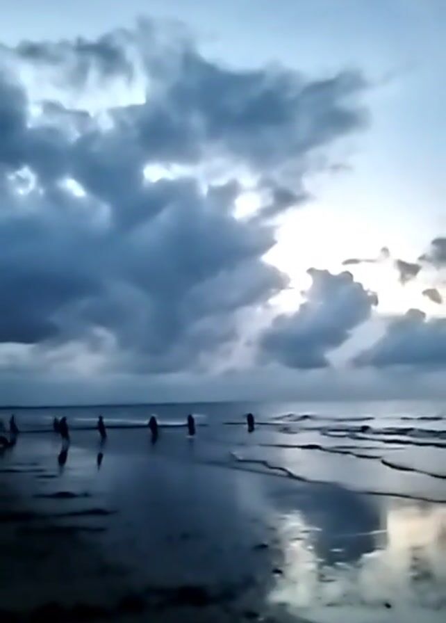 The scene is a beach with a group of people silhouetted against the horizon. The sky is filled with heavy, dark clouds with the sun peeking through, creating a bright spot. The beach appears wet, and the water reflects the sky, creating a mirror-like effect. The people are scattered along the shoreline, some standing still and others seemingly moving, perhaps walking in the shallow water. The overall atmosphere is serene yet somewhat ominous due to the dark sky.
