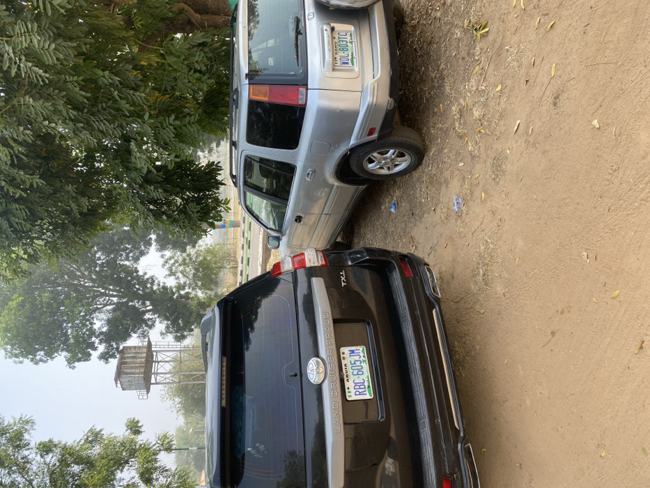 The scene in Yan Dala, Nigeria, features two sport utility vehicles parked on a dry, reddish-brown dirt surface