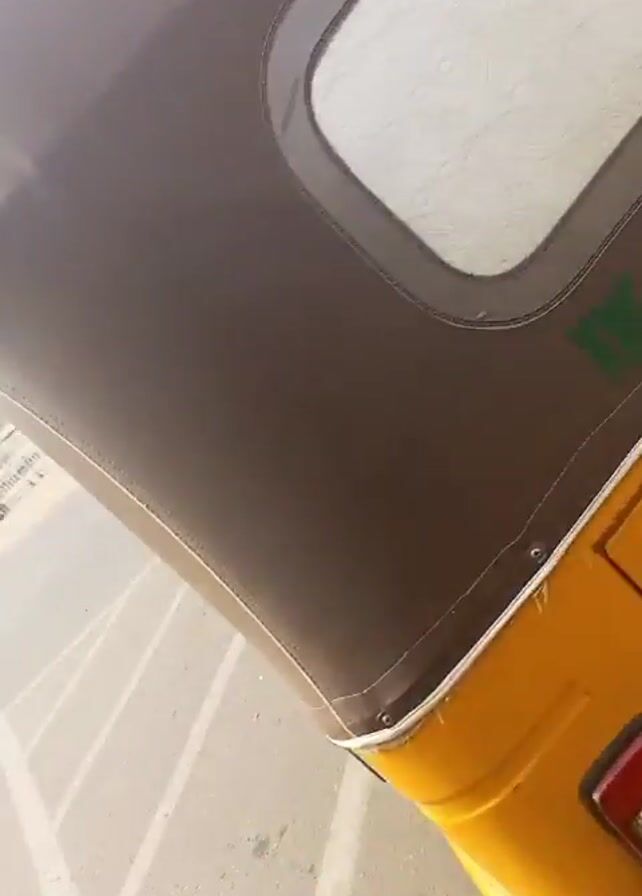 yellow auto rickshaw on a road in an urban environment. Several people are visible, including one walking away from the rickshaw in the first few frames and another riding a motorbike on the side of the road. There's a petrol station visible in the background with multiple rickshaws parked near it. The rickshaw the video is being taken from starts moving and driving through the streets. There are other rickshaws and vehicles seen along the roads. The architecture around features multistory buildings.