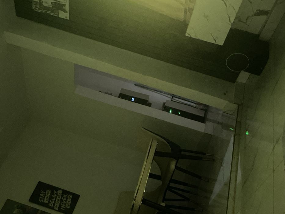 This image captures an interior scene, likely a residential or commercial building, located in Okpanam, Nigeria. The environment is dimly lit with a pervasive green hue. In the left foreground, a dining area is visible, featuring a table with a light-colored surface and dark, thin legs accented with gold. Two matching chairs are positioned around it. Above the dining area on the wall, a rectangular black framed poster displays white text: "STAY STRONG BELIEVE IN YOURSELF NEVER GIVE UP." Towards the center and right, an open doorway or hallway leads deeper into the structure. Within this passage, two vertical electronic devices are mounted, each displaying active green indicator lights. The upper device also shows blue indicator lights. The floor consists of light-colored, possibly polished, tiles which reflect the green lights from the devices. A prominent white column or architectural feature separates the main room from the hallway on the right. Below this column, a dark, rectangular object with a circular feature (possibly a speaker) is partially visible. The wall above this object is adorned with white, marble-patterned paneling or tiles. No individuals or specific actions are depicted.