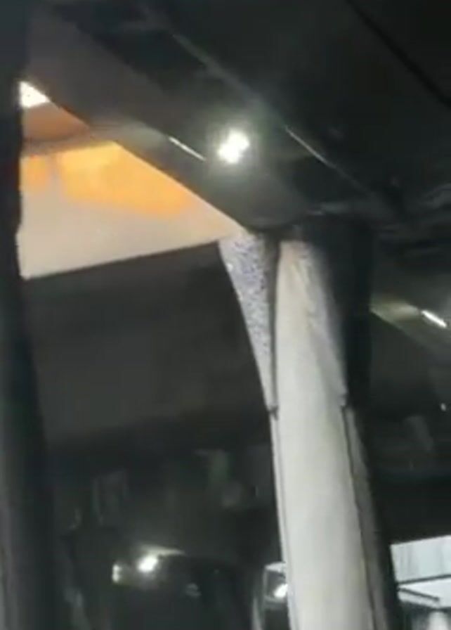 low-angle view of concrete pillars supporting a structure overhead. The pillars have a flared design at the top where they meet the structure. There are small, square lights attached to the underside of the overhead structure. The lighting conditions are somewhat dim, and the camera appears to be moving slightly.