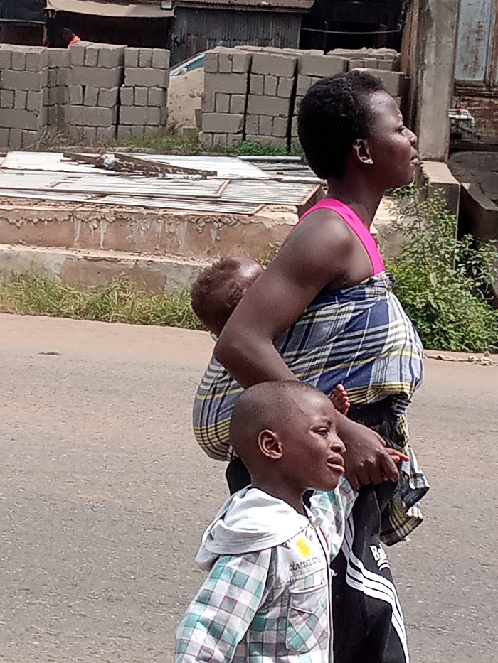 An adult female, a male infant, and a young boy are observed in an outdoor setting on a paved surface, consistent with a street or road in Onitsha, Nigeria