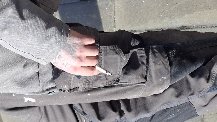 The image displays a close-up, waist-down view of an individual situated outdoors in Leudelange, Luxembourg. The subject is wearing a grey long-sleeved garment, possibly a sweatshirt, with a visible patterned cuff on the right arm. Below this, dark grey work pants are worn, featuring multiple utility pockets, including a large cargo pocket on the right thigh. The pants exhibit signs of wear, including white and yellow/orange paint splatters, particularly on the left leg and the cargo pocket. A black zipper and a black elastic cord with a plastic toggle are visible features on the pants. The person's right hand is prominent, showing extensive dark-ink tattoos on the back and forearm. This hand is holding a lit cigarette between the thumb and forefinger, with a distinct ash tip visible. The background consists of a light grey concrete or paved surface, suggesting an outdoor setting, with minor particulate debris scattered. The lighting indicates direct sunlight.