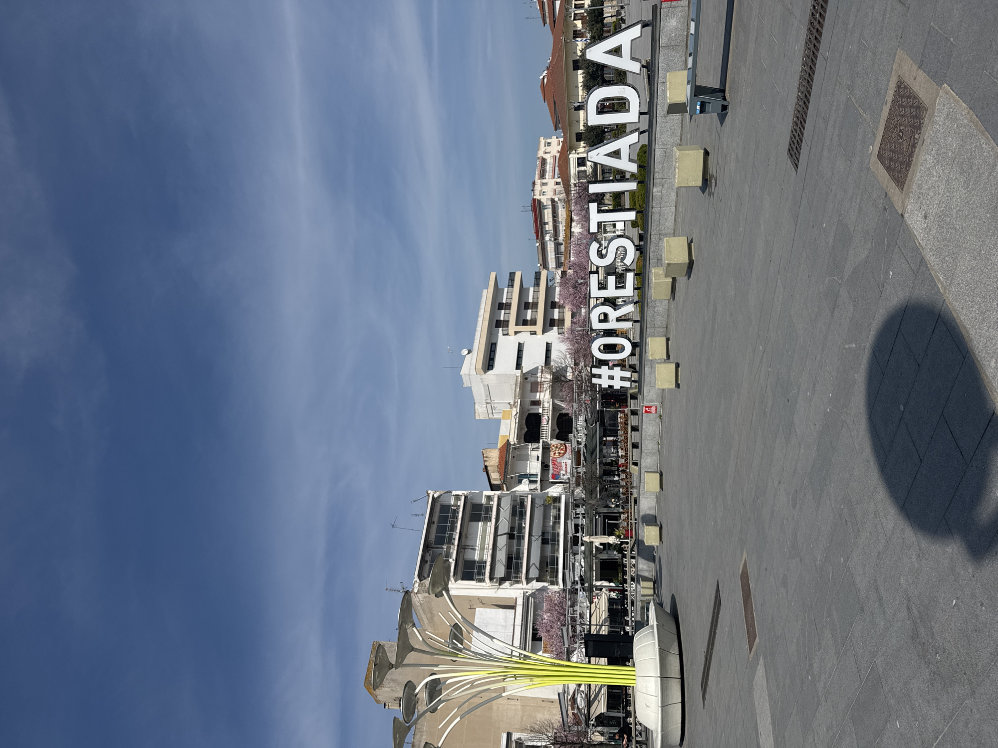 The image captures a public square or plaza in Orestiada, Greece, under a clear blue sky with scattered cirrus clouds. Prominently featured in the mid-ground are large, white three-dimensional letters spelling "#ORESTIADA," set upon a dark, raised base. To the left of the sign, a tall, decorative structure with a central beige column branches out into multiple neon yellow-green stalks, each terminating in a white disc, supported by a circular white base. The plaza floor consists of dark grey square paving stones. Several light-colored concrete cube bollards are distributed across the square, and a modern metallic bench with a blue seat is visible on the far right. In the background, a series of multi-story urban buildings line the square, featuring balconies, some with grey awnings, and various architectural styles. Ground-level establishments include cafes and restaurants with outdoor seating areas and umbrellas. A "ROSSO" sign displaying pizza is visible on one building facade. Sparse greenery, including trees with pink blossoms, is present behind the cafes and the sign. Indistinct human figures are observed seated at outdoor tables on the left side of the square. Shadows cast on the ground indicate a sunny daytime scene.