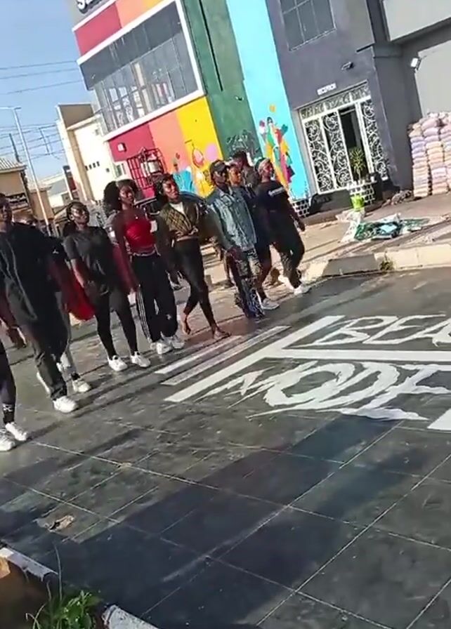 A group of approximately 10 young people are seen performing a synchronized dance routine on a black-tiled pavement