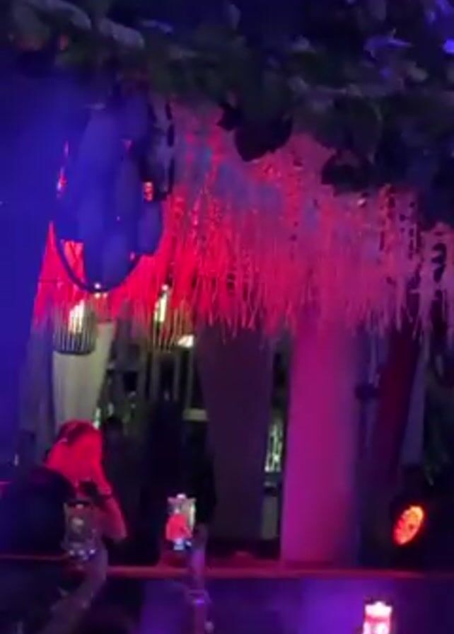 A low-angle shot shows a woman with long hair, wearing a black strapless dress, standing behind a slightly elevated counter in a club or event space. The space is illuminated by colored lights: mostly red and purple. In the background, there are blurry figures of people, curtains, and hanging decorative elements that resemble straw or similar materials. Several hands holding cellphones are visible in the foreground, presumably recording the woman, who is looking down, possibly interacting with something on the counter. A large speaker cluster is visible on the left, and there are other lighting fixtures around the space.
