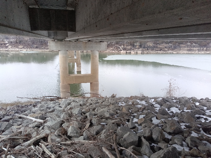 A gray, overcast day views a bridge spanning a body of water. The bridge's underside and support pillars are visible above. Below the bridge lies a rocky shoreline with scattered snow and dry branches. The water appears calm, with a slight greenish tint. Bare trees line the distant bank across the water, partially obscured by the low-hanging clouds.