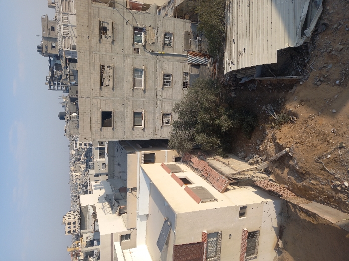 The image provides an elevated view of an urban area in Khan Yunis, Palestinian Territory, characterized by extensive structural damage under a clear sky. In the foreground, disturbed earth and rubble are visible, sloping downwards. To the immediate right, a section of a corrugated metal roof is present, appearing partially collapsed and bent. A concrete retaining wall borders the earth on the left side. In the midground, two primary buildings are prominent. On the left, a cream-colored, multi-story building with dark-framed windows shows several small circular impacts consistent with bullet holes on its facade. Solar panels are installed on its flat roof. Below, a covered balcony or walkway with a reddish-brown tiled roof is attached to the building. Separated by a narrow, debris-strewn gap containing sparse green vegetation, a grey, multi-story building constructed of concrete blocks stands to the center-right. This building exhibits substantial damage, particularly on its upper floors, with multiple window openings empty and exposing internal structures. Visible wiring runs along its exterior. The background reveals a dense cityscape extending to the horizon. Numerous multi-story buildings are visible, many displaying signs of extensive damage, including collapsed sections, missing roofs, and exposed structural components. Water tanks are visible on several rooftops across the urban landscape. No individuals are discernible within the frame.