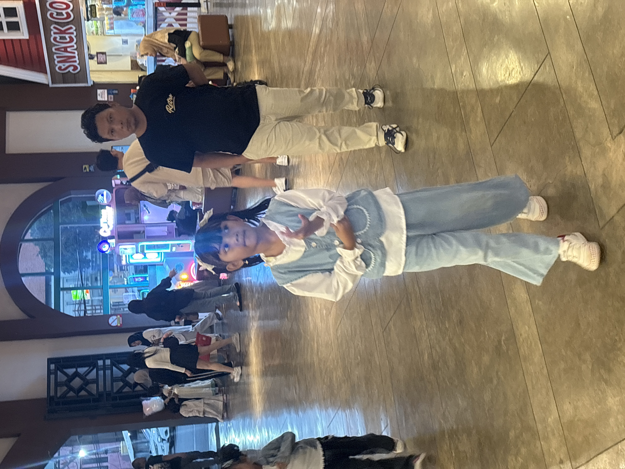 The image captures a moment inside what appears to be a commercial establishment in Prigen, Indonesia. A man and a young girl are prominent in the foreground. The man wears a black t-shirt and light-colored pants. The girl is dressed in light blue clothing. Several other people are visible in the background. There is a "Snack Corner" visible. Through a large archway, there is a glimpse of what seems to be an outdoor arcade or entertainment area. The floor is covered with ceramic tiles.
