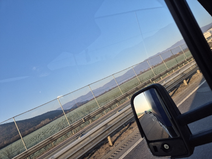 The image presents a tilted view from inside a vehicle, observing a highway environment in Novachene, Bulgaria. In the lower-left foreground, a black vehicular side mirror is prominent, reflecting the vehicle's blue body and the receding asphalt highway behind it, where a distant vehicle is partially visible. Parallel to the vehicle's direction of travel, a multi-segment metal guardrail extends along the road's edge, followed by a wire mesh fence. Beyond this roadside infrastructure, an expansive cultivated field of green vegetation stretches towards a distant, undulating range of hills or mountains. The upper portion of the frame consists of a clear, light blue sky, within which a small, faint white object, consistent with the moon, is visible. Subtle reflections are present on the vehicle's windowpane.