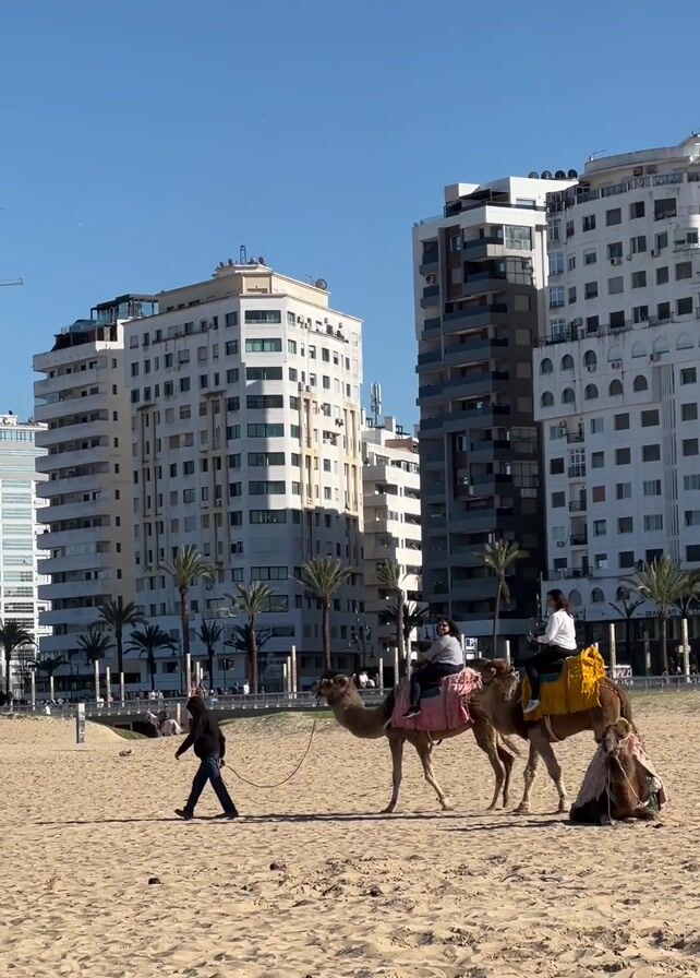 two camels walking on a beach, each carrying a person. A man walks alongside them, leading the camels. In the background, there are tall white buildings, palm trees, and a clear blue sky. The beach is sandy and sunny. Other people can be seen walking in the background.