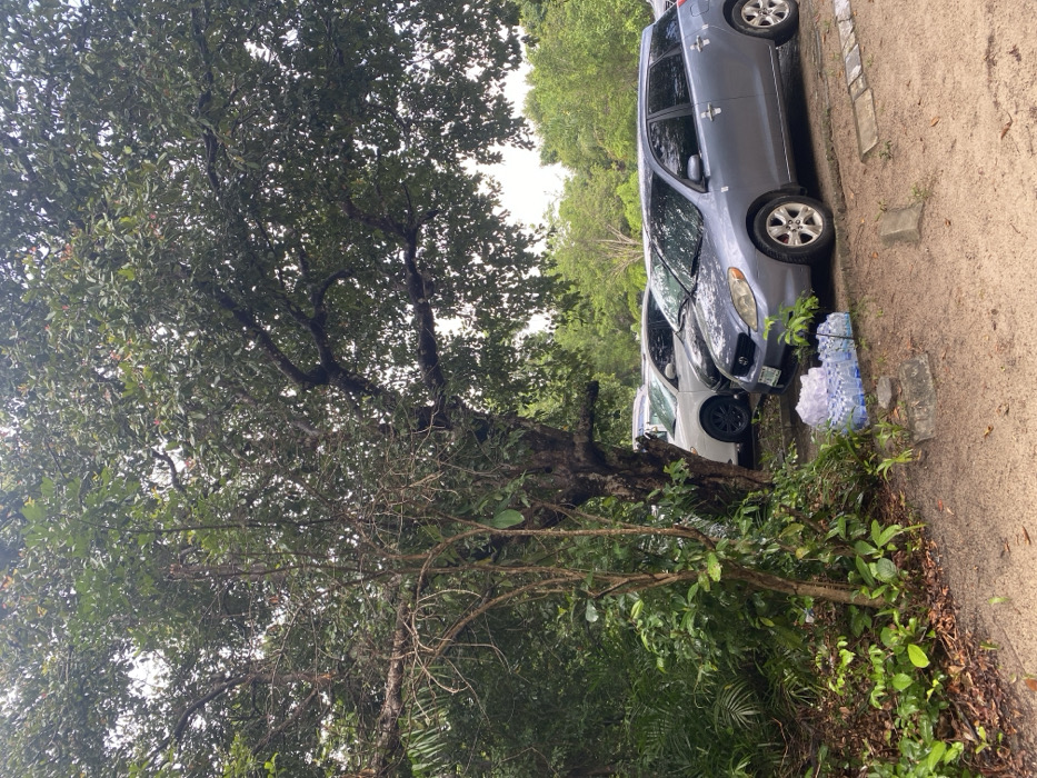 The image depicts an outdoor scene in Ikota, Nigeria, characterized by dense tropical vegetation and parked vehicles. The foreground consists of reddish-brown earth and sand, with scattered small green plants and two embedded concrete blocks. To the left, a thick growth of green bushes and palm-like fronds forms an understory, from which a tree with a dark, gnarled trunk and thinner, mostly bare branches extends upward. A large, mature tree with a dense canopy of dark green leaves dominates the upper half and midground, casting shade. Three vehicles are parked on the right side of the frame. The most prominent is a light blue/grey hatchback, possibly a Toyota Matrix, positioned in the right-center. It features four doors, silver alloy wheels, and small white decorative elements on its passenger side doors. A partially visible Nigerian license plate is affixed to its front. Adjacent to the front passenger side of this vehicle, several clear plastic bundles of bottled water are stacked on the ground. Behind the light blue/grey hatchback, a dark-colored sedan or hatchback is partially visible, followed by a white sedan with dark wheels further back and to the left. The background reveals more green trees and foliage under an overcast sky. No people or observable actions are present.