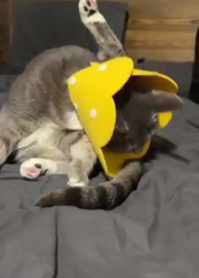 A close-up video shows a gray tabby cat wearing a yellow, flower-shaped cone with white polka dots on a gray bedspread in a room with wooden walls
