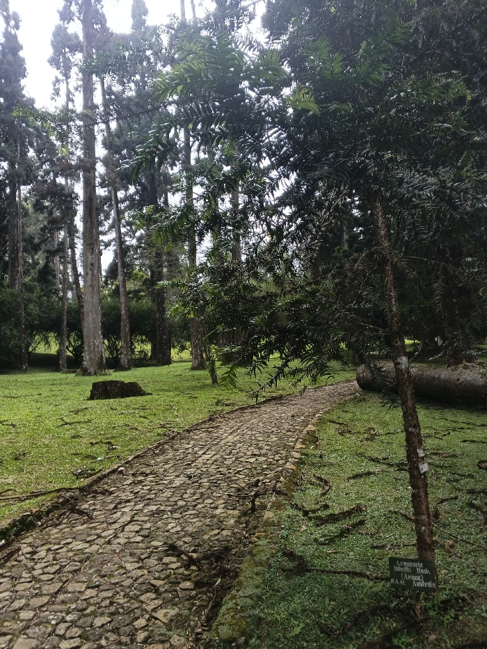 The scene depicts an outdoor arboretum or park in Kwekwe, Zimbabwe. A winding cobblestone pathway, approximately 1.5 meters in width, originates from the lower left foreground and curves towards the right, receding into the mid-ground. The ground is predominantly covered by lush green grass, interspersed with visible tree roots and patches of moss, particularly along the path's edges. Numerous tall, slender trees with straight, light gray trunks and sparse lower foliage dominate the background and mid-ground, extending towards an overcast, light gray sky. In the foreground, on the right side of the path, a smaller tree with dark green, dense foliage stands. Attached to this tree's trunk is a dark, rectangular informational sign with white text that reads: "Araucaria hunsteinii (K.Schum.) K.Schum. (Arauc.) Papua New Guinea / Australia". To the left of the path, in the mid-ground, a dark, weathered tree stump, approximately 0.5 meters high, is present. Further to the right of the path, also in the mid-ground, a large, dark, horizontally oriented log, consistent with a fallen tree trunk, rests on the grass. No human subjects, animals, or explicit actions are observed within the frame. The lighting is soft and diffused, indicative of an overcast sky.