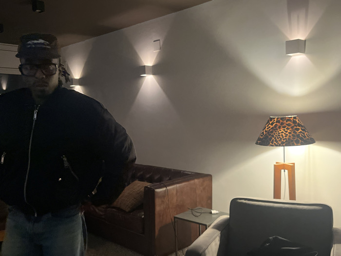 A person wearing a dark jacket, jeans, a cap, and eyeglasses stands in a room with wall-mounted lights. Behind the person, a brown leather couch is partially visible. To the right, a leopard print lampshade sits atop a wooden lamp base near a gray armchair and a small side table. The lighting creates a warm, indoor ambiance.