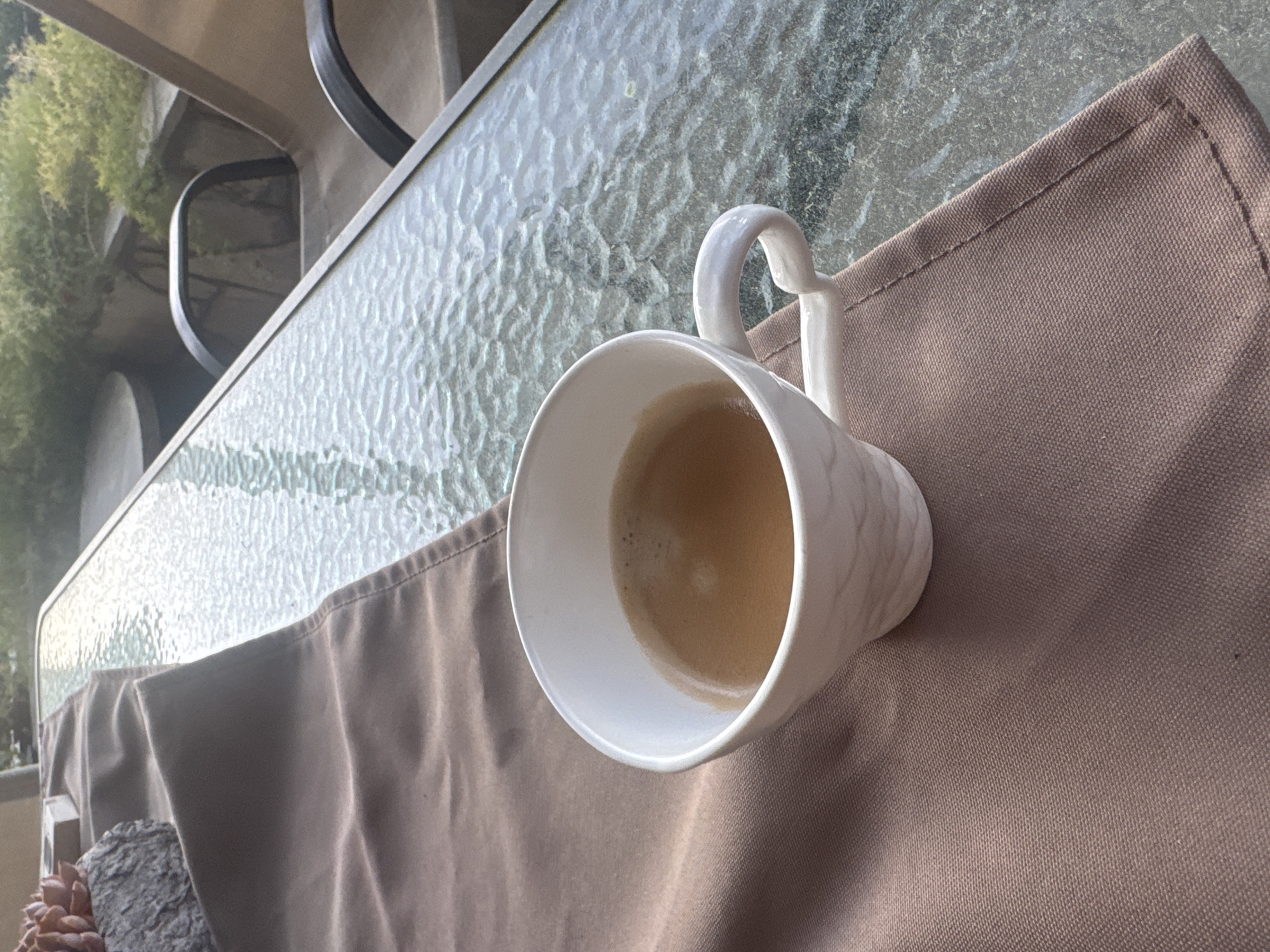- "A high-angle shot shows a white coffee cup with coffee inside sitting on a brown placemat" by FM-Gf6gR2, licensed under CC BY 4.0