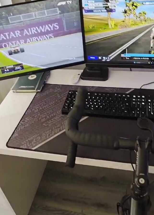The camera rotates around a bicycle that's set up as an indoor training bike in front of a desk. The desk has two monitors, a keyboard, and a mousepad. The left monitor shows a live Formula 1 race, while the right monitor shows the Zwift cycling simulation. A notebook is on the desk as well. The bike has black drop handlebars. The floor is light grey wood. The wall has a white roller blind and a white switch.