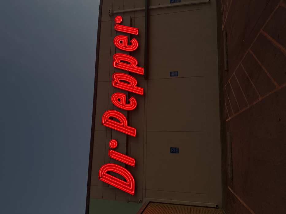 The image depicts a vertically oriented neon sign for "Dr. Pepper" in bright red. The sign is mounted on a pale building with a dark sky visible to the left. To the right of the building is a dark brick or stone surface. The sign's neon tubes are clearly visible. Three small blue and white handicapped accessibility signs are located on the building facade behind the "Dr. Pepper" sign.
