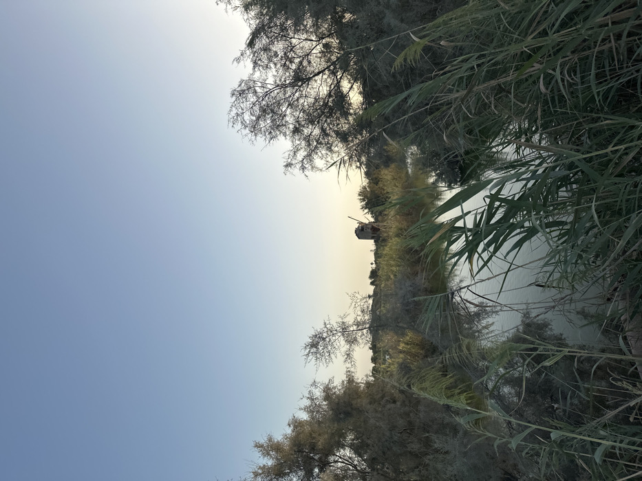 The image displays a natural landscape within the Hof HaCarmel Regional Council, Israel, under a clear, transitioning twilight sky. The upper two-thirds of the frame shows a gradient sky, light blue at the zenith fading to a pale yellow-orange near the horizon line. A placid body of water occupies the midground, reflecting the sky and adjacent vegetation. The foreground and midground are heavily populated by dense, tall green reeds and various types of bushy foliage bordering the water. In the distant background, slightly to the right of the central axis, a weathered, dark structure resembling an old windmill or tower is silhouetted against the lighter sky, surrounded by distant trees and vegetation. No individuals or explicit actions are visible within the scene.