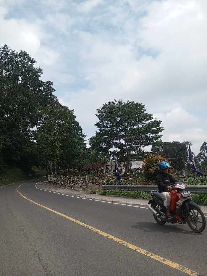 A motorcycle rider with a blue helmet travels along a paved road marked with a yellow center line. The road curves to the left, lined with lush green trees and vegetation. A bamboo fence borders a building in the background. Cloudy skies fill the top portion of the frame.