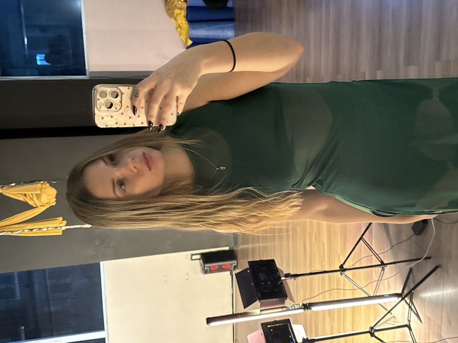 A young woman takes a selfie in a mirror. She is fair-skinned with blonde hair, wearing a sheer, dark green top. The phone has a case with small red hearts. In the background, there is lighting equipment, including tripods with lights, indicating a studio or photography space. A glimpse of a window, aerial yoga equipment, and a wood floor can also be seen.