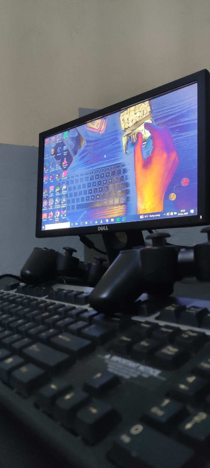 A Dell monitor displays a desktop background with a hand holding a box of pills. Below, a black keyboard with gold lettering is in focus. On top of the keyboard are two black game controllers. The wall is a light gray color, and the time on the monitor displays 20:24 on December 29, 2023, with a temperature of 33°C and partly sunny weather.