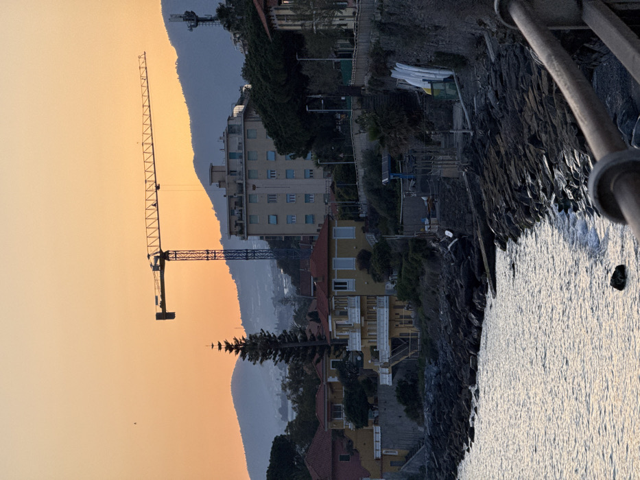 This image depicts a coastal scene in Sanremo, Italy, during either sunrise or sunset, indicated by the warm orange-yellow gradient sky. In the background, hazy blue mountains rise, with a white cellular or radio tower visible on a distant peak to the right. Dominating the mid-ground against the sky is a large tower crane, featuring a blue vertical mast and a long, horizontal yellow boom. Below the crane, a multi-story, light-colored apartment or residential building with multiple windows is situated on an elevated part of the terrain. To the left of this building, a tall, slender conifer tree stands prominently amidst other structures. Closer to the water, along the rocky coastline, several yellow villas with red tile roofs and white balconies are built into the hillside. One villa in the center features external white staircases. The immediate foreground shows a dark, rugged rocky shoreline meeting calm, shimmering water that reflects the sky's hue. Along the immediate shore, small structures, potentially boathouses or storage units, are visible. Several white, elongated objects, likely kayaks or small boats, are stored vertically against a retaining wall. A metal railing is present in the lower right corner, partially obscuring the water's edge. Streetlights are visible along a paved area above the shore. No human figures or discernible activities are present in the scene.