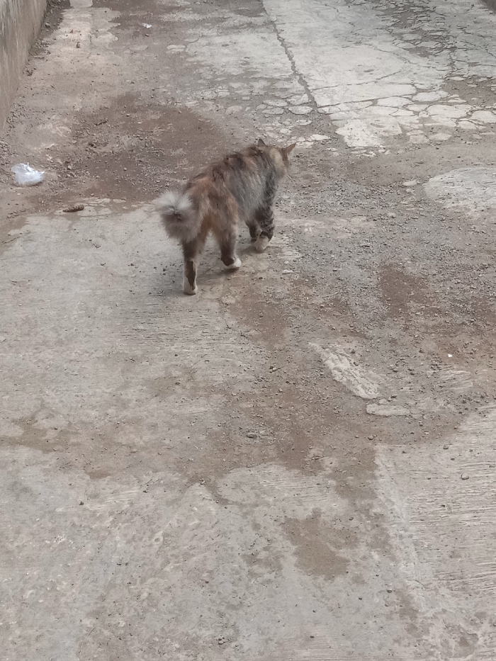 A domestic cat is depicted walking on a concrete and dirt path in Ciherang, Indonesia. The cat, viewed from the rear, possesses a multi-toned coat with shades of brown, black, and lighter fur, consistent with a tortoiseshell or calico pattern, and has long, somewhat matted hair. Its tail is fluffy and held upwards. White markings are present on its hind paws. The animal is moving towards the upper right of the frame, with its head slightly turned to the right. The ground surface consists of cracked, uneven grey concrete intermixed with areas of loose earth and gravel, displaying several damp or discolored patches. In the upper left portion of the image, near a light-colored vertical wall or edge, a crumpled white plastic bag and a small, dark, cylindrical object are present on the ground.