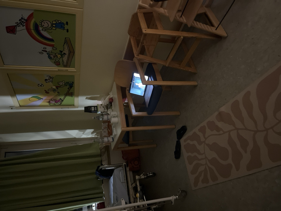 The image depicts a dimly lit indoor room, identified as a hospital room in Bad Kreuznach, Germany. The environment suggests a pediatric or family-friendly ward due to specific items present. To the left, a hospital bed with a light blue sheet is partially visible, obscured by a white mobile medical stand. Dark green curtains are drawn across a window behind the bed. On the floor near the bed are a dark blue backpack and two reddish-orange bags or objects. In the center, a light wooden table holds two water bottles, one identifiable as "Gerolsteiner," two white mugs, a black container, and various snack items or wrappers. Two light wooden chairs with blue upholstered seats are positioned around this table; one is pushed in, and the other is pulled out. A silver laptop, open and displaying a bright image of a human-like figure against a light background, rests on the pulled-out chair. To the right of the table, two wooden high chairs are stacked or positioned one behind the other. The wall behind the table and high chairs features two framed illustrations with childlike drawings depicting scenes such as a balloon, seesaw, soccer ball, sandbox, rainbow, and kite. On the light gray floor, a light-colored rug with a large, stylized leaf or organic pattern in a darker beige/brown is laid out in the foreground. Two dark-colored sandals or slippers are on the floor near the rug and the chair with the laptop. No individuals are present in the scene. The activated laptop and items on the table indicate recent occupation.