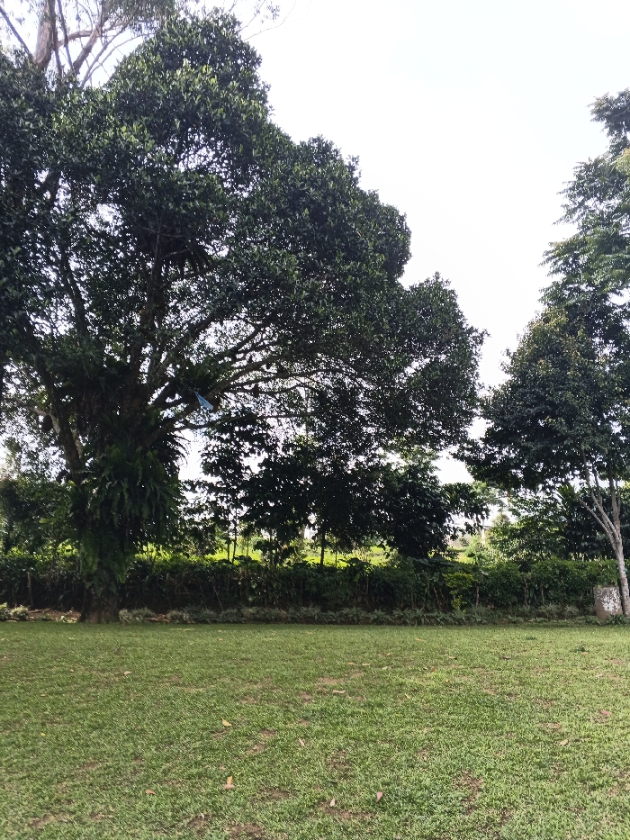 Lush green lawn dominates the foreground, subtly revealing hints of brown earth beneath. A vibrant hedge of dark green shrubs defines the middle ground, creating a natural border. Behind the hedge, taller trees stand majestic, their dense canopy partially obscuring the sky. A solitary tree, adorned with hanging foliage, stands prominently on the left, its aged trunk providing a focal point within the scene.