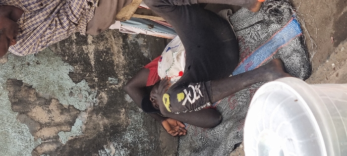 A person lies on a mat or blanket on the ground, with their arms raised and hands near their head. They are wearing black pants with white lettering on the lower leg, a red shirt, and black skin. Another person lies next to them wearing a plaid shirt. The ground appears to be rough and cracked, with peeling paint on a concrete surface. A white bucket is visible on the right side of the image.
