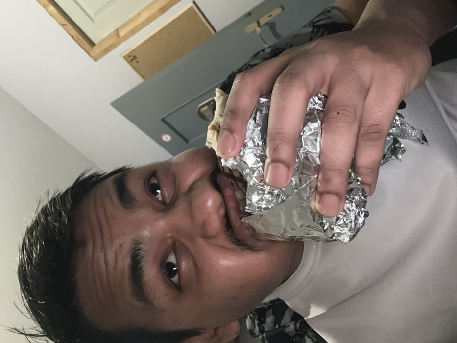 - "A man with dark hair, a mustache, and a white t-shirt is holding a foil-wrapped burrito" by FM-txt2A3, licensed under CC BY 4.0