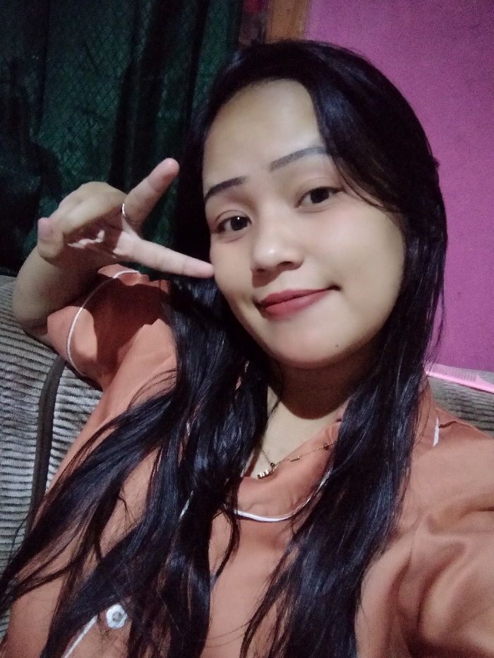 A medium shot depicts a single individual, identified as a young adult female, positioned indoors within the city of Unknown, Unknown. The subject has dark, long, wavy hair and a light to medium complexion. She is wearing a salmon-colored collared shirt with white piping and a gold-toned necklace with small, bar-shaped links. A silver-toned ring is present on her right index finger. Her right hand is raised to the left side of her head, displaying a "peace" sign with her index and middle fingers extended. The subject is looking directly at the camera with a subtle, closed-mouth smile. She appears to be seated on an upholstered object featuring horizontal stripes, partially visible on the lower left. The background consists of a dark green, textured material, possibly a curtain, on the left, and a solid bright pink wall on the right.
