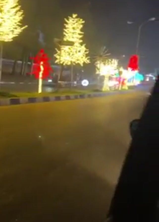 nighttime scene from the passenger seat of a car. The car is driving on a road lined with trees and decorative light installations, primarily in yellow, white, and red. The camera angle is looking out the side window, and the perspective shifts as the car moves. The decorations include tree-shaped lights and round illuminated objects, set along a median with a blue and white curb. The interior of the car is visible, including the headrest of the driver's seat and the car's frame. Another vehicle is visible ahead on the road.