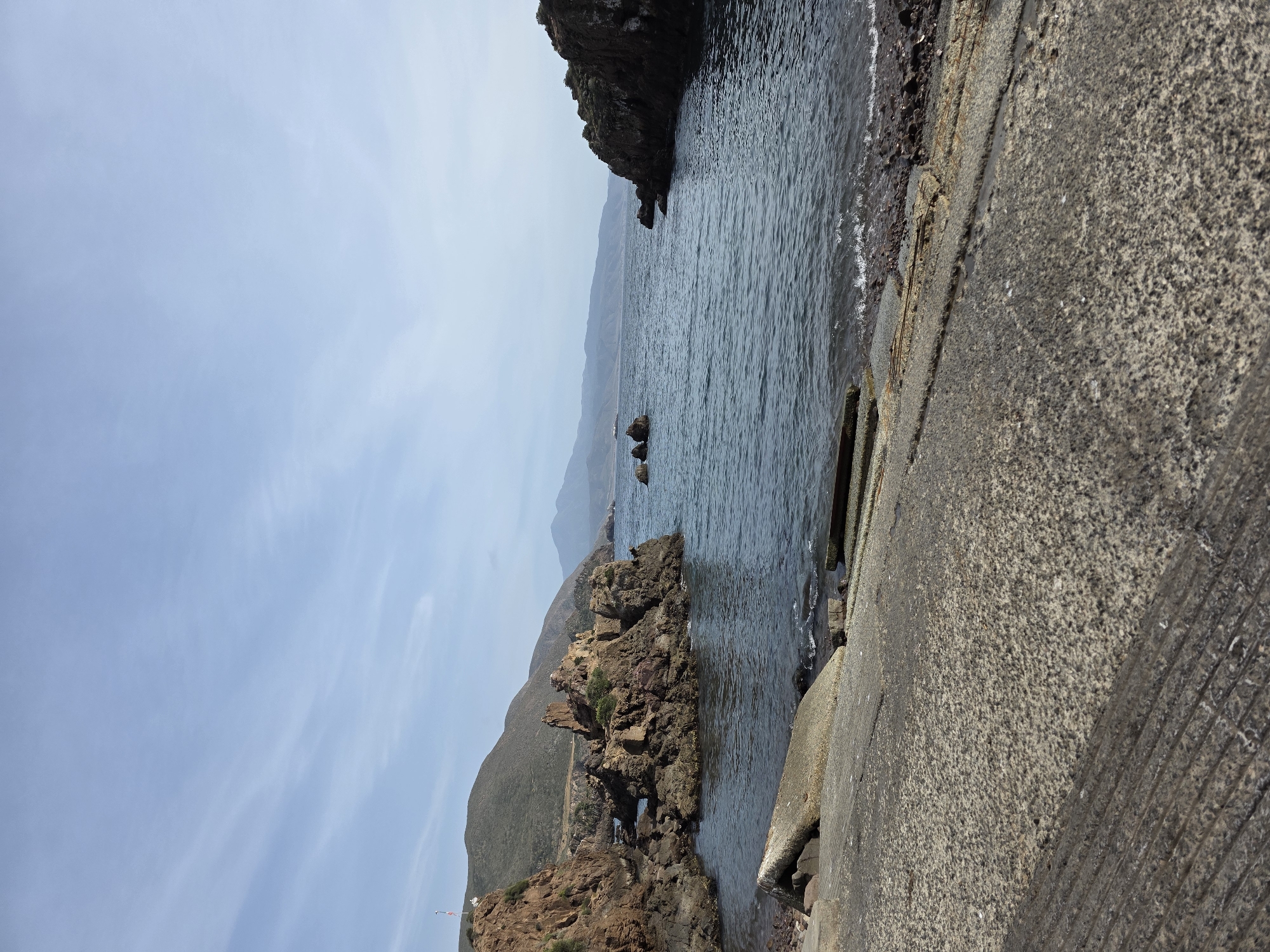 The image captures a coastal scene in Ensenada, Mexico, showing a concrete embankment bordering the sea. The water is a deep blue, with small waves lapping against the rocky shoreline. In the foreground, a rough, textured concrete surface dominates, possibly a pier or pathway. Rocky outcrops extend into the sea, with one larger, dark rock formation visible towards the top left of the frame. Further inland, a mountain range fades into the hazy background under a blue sky with sparse clouds. The composition is oriented vertically, emphasizing the height of the landscape elements. No people are immediately visible in the scene.