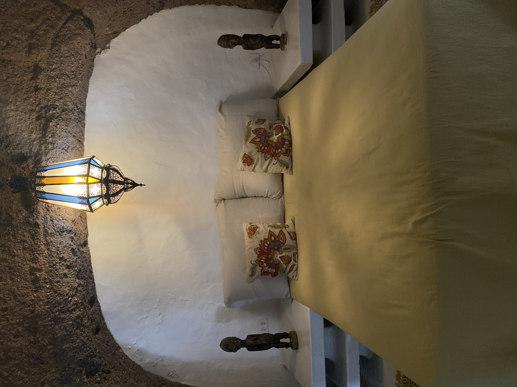 The image depicts an interior setting, potentially a bedroom, within a building located in Teguise, Spain. The room is characterized by a distinctive architectural feature: a wall that transitions from rough, stone-like texture on the left to a smooth, whitewashed surface. A hanging lamp with a blue, yellow, and white glass shade is positioned on the stone section, providing illumination. The right portion of the image is dominated by a bed covered in a light yellow or tan-colored bedspread, featuring two throw pillows with floral patterns. Two small, wooden figurines are placed on shelves near the head of the bed, with one on each side. The room is dimly lit, casting shadows that emphasize the textures and architectural details.