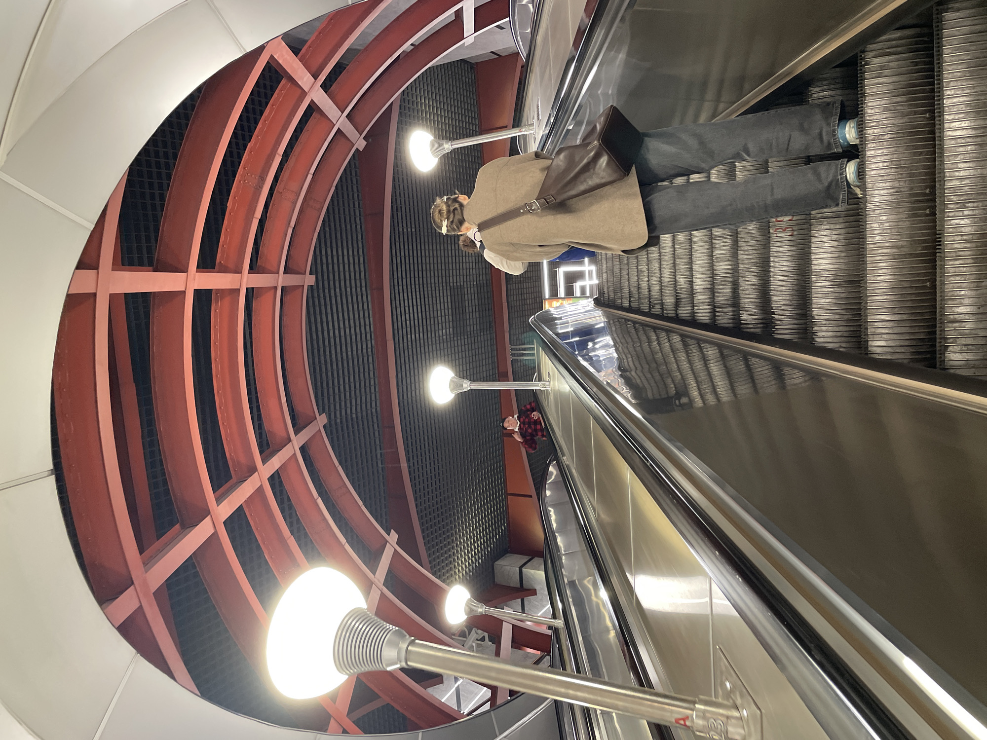 The image depicts a person on an escalator descending in a metro station in Saint Petersburg, Russia. The escalator is silver with ribbed steps. The person is wearing a light brown coat, grey jeans, and blue shoes, carrying a dark brown shoulder bag. They are facing forward as the escalator descends. The architecture is notable, featuring a red, arched, grid-like structure above the escalator. The ceiling above the structure appears to be white. Four spherical, white lamps are positioned along the escalator's path. Another person is visible behind the subject, wearing a red and black plaid shirt.