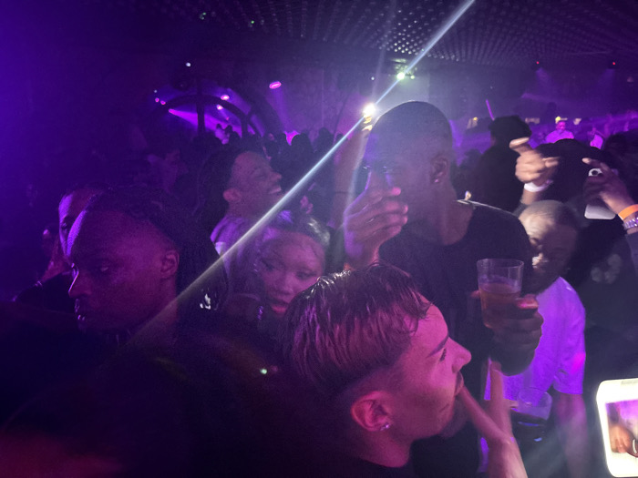 A crowded nightclub scene is illuminated by vibrant purple lighting and a sharp light beam. Several people are visible, including a man in a black shirt holding a beverage. The crowd appears densely packed, and some individuals are holding up phones, possibly recording or taking photos. The setting suggests a lively and energetic nightlife atmosphere.