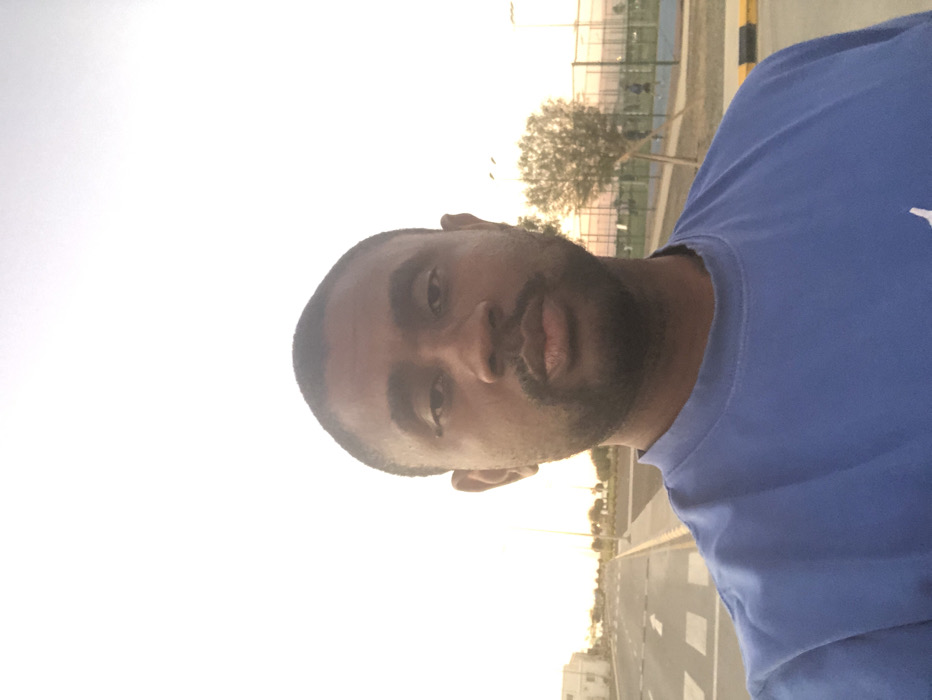 A dark-skinned male with short dark hair, a trimmed beard, and a mustache is positioned centrally in the foreground, wearing a royal blue crew-neck t-shirt and looking directly at the camera. The scene is outdoors in the city of Hanak, Saudi Arabia. Behind the individual, an asphalt road marked with white directional arrows and a concrete median extends into the distance on the left, flanked by low-rise, light-colored buildings and streetlights. To the right, sparse trees separate the paved area from an enclosed sports court, which features a perimeter fence and distinct ground markings. At least two indistinct human figures are visible on the court, suggesting active use. The sky transitions from a bright white overhead to a light orange-pink hue near the horizon, indicating either early morning or late afternoon lighting conditions. The overall environment presents as an arid urban or semi-urban landscape.