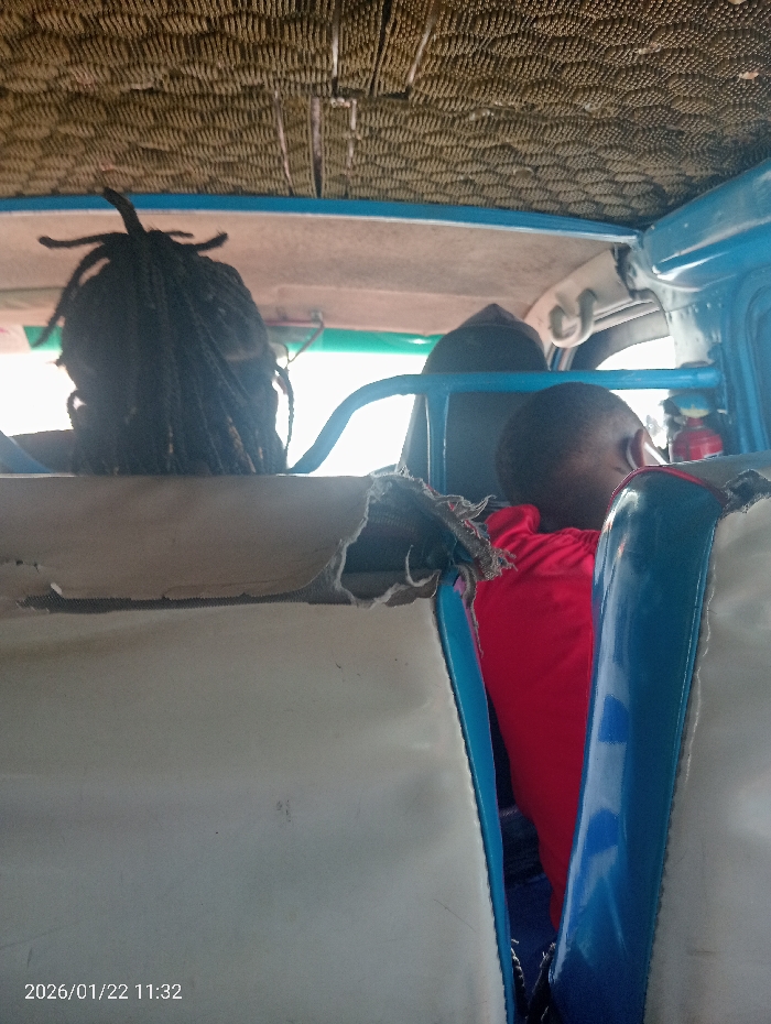 The image depicts the interior of a public transport vehicle, observed from the perspective of a rear passenger. The location is undetermined. In the foreground, the top of a light-colored seat with visibly torn and degraded upholstery is prominent. Ahead and to the left, the back of an individual's head is visible, featuring dark, thick braided hair styled upward. To the right, another individual is present, viewed from the back and right profile, wearing a red garment and possessing short dark hair. A light blue metal safety bar extends horizontally across the mid-ground. The vehicle's ceiling is covered with a textured, woven material in a dark beige or brown hue, displaying a repeating pattern. A small red fire extinguisher is mounted on the right interior wall of the vehicle, behind the person in red. Bright daylight is visible through an opening or window in the upper background. The overall condition of the vehicle's interior indicates significant wear and tear. The embedded timestamp indicates the image was captured on 2026/01/22 at 11:32.