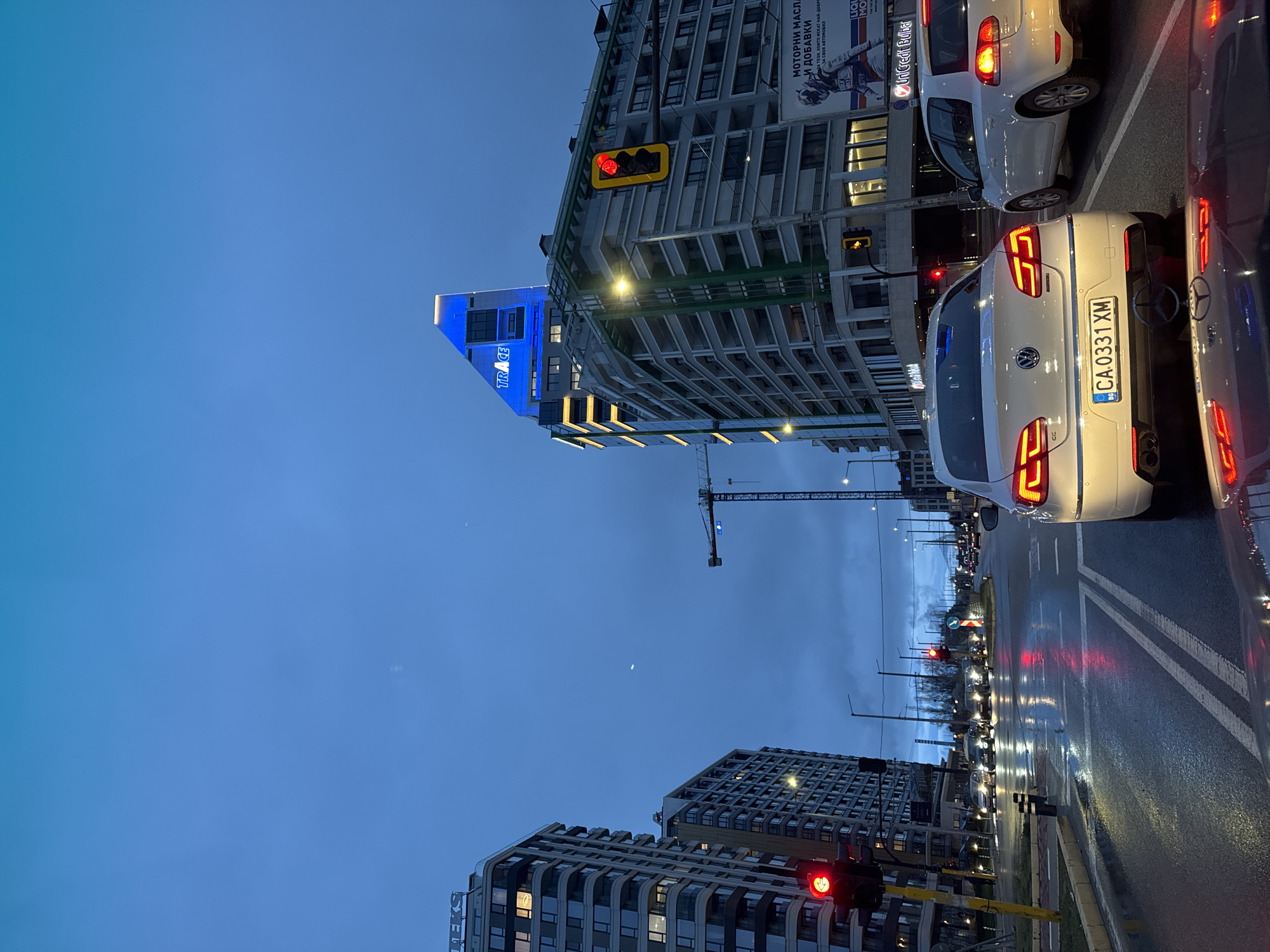 The image captures a cityscape in Sofia, Bulgaria at dusk. In the foreground, cars are lined up at a red traffic light on a wet road. A white Volkswagen CC with the license plate "CA.0331 XM" is prominently visible. Above the cars are buildings with commercial signs written in Bulgarian and English. The "TRACE" building is illuminated with blue lights. A construction crane is visible in the background. The sky is a mix of blue and overcast gray.