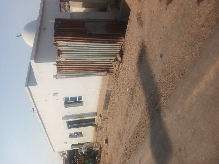 The image depicts a single-story, white-painted building, identified as a mosque by the white dome topped with a blue crescent moon symbol on its flat roof, located in Zango-ndaji, Nigeria. The building features three rectangular windows with white frames and two dark-colored entrance doors on its visible front facade. A slightly raised concrete base runs along the building's front. To the immediate right of the building, a weathered, heavily rusted corrugated metal sheet structure serves as a partition or fence. In front of the building, near its left side, two individuals are present on a dirt and gravel path. One person, wearing a green shirt, is squatting, while another in a light-colored shirt is bent over, both appearing to be engaged in an unspecified activity with objects on the ground, possibly involving construction blocks visible nearby. The foreground shows an unpaved or poorly maintained road surface composed of dark asphalt mixed with significant patches of dirt and gravel. Long, dark shadows are cast across this road from left to right, suggesting bright sunlight. The sky above is clear and light blue.