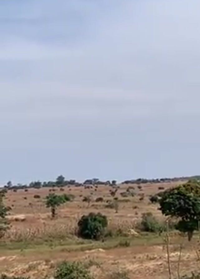 view of a dry, grassy field with scattered trees under a cloudy sky. A low brick wall is in the foreground. The audio mentions that the houses in this area have been wiped out by Fulani terrorists.