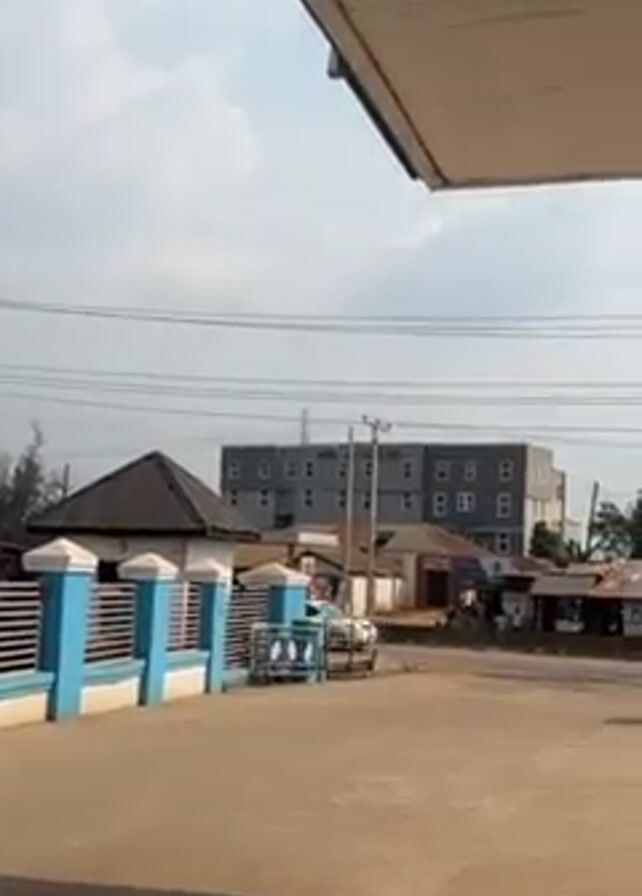 The camera pans across a gas station with Matrix branded pumps under a white awning supported by pillars. The gas station appears to be located in a populated area, with buildings and power lines visible in the background. There is a blue and white fence surrounding a building on the side. There are several gas pumps with black hoses and a fire extinguisher is mounted on a pillar. There are no people visible in the immediate vicinity of the gas pumps.