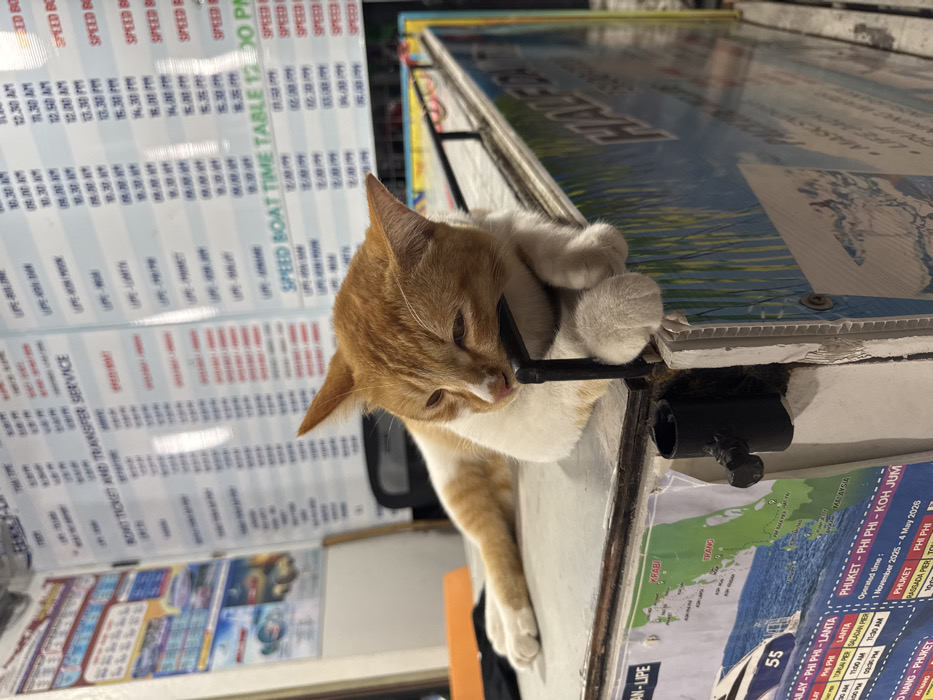 An orange and white tabby cat is observed resting on a light-colored counter surface within a boat ticket office or ferry terminal in Ban Ko Li Pe, Thailand