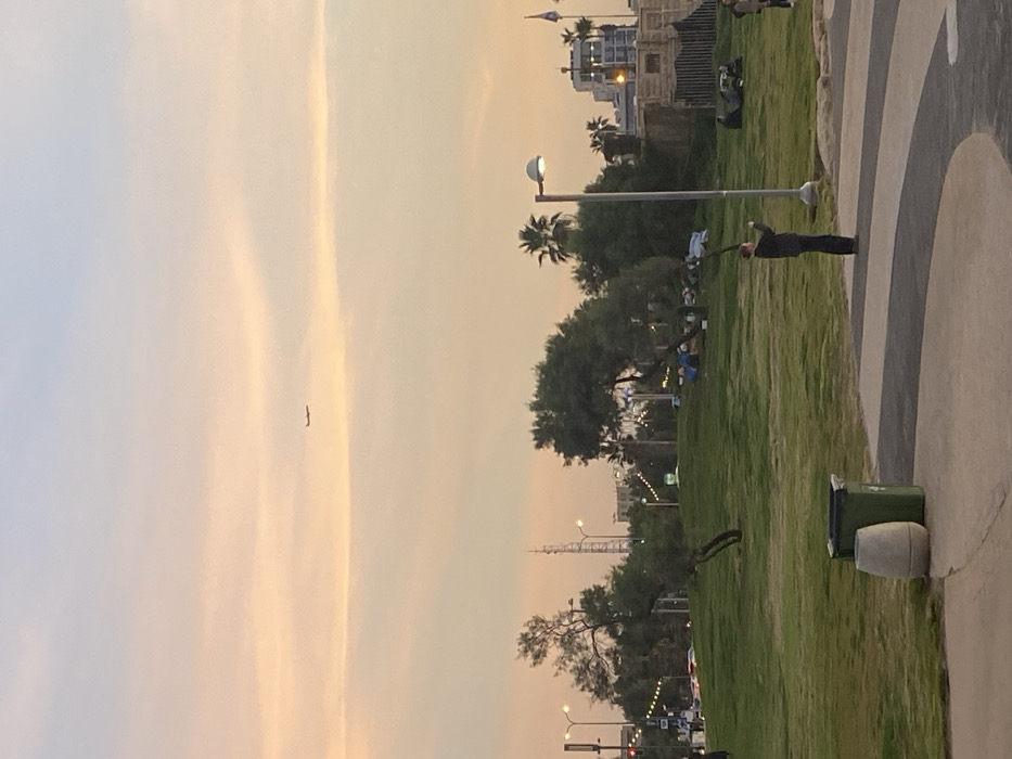 An outdoor scene captured at dusk or sunset displays a coastal park environment in Tel Aviv-Yafo, Israel