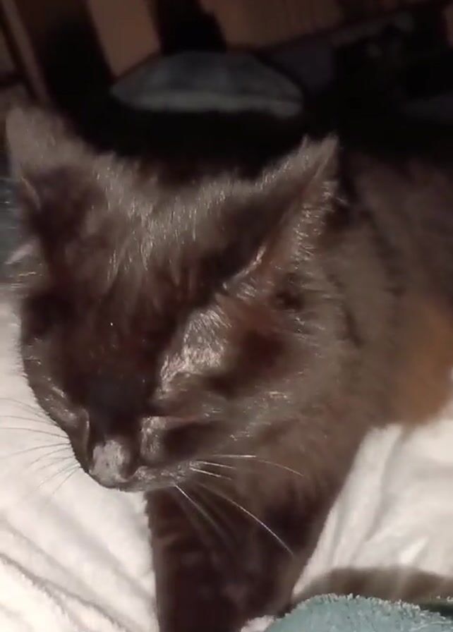 A black cat is resting on a white and blue blanket. The cat slowly opens its eyes, revealing yellow irises.
