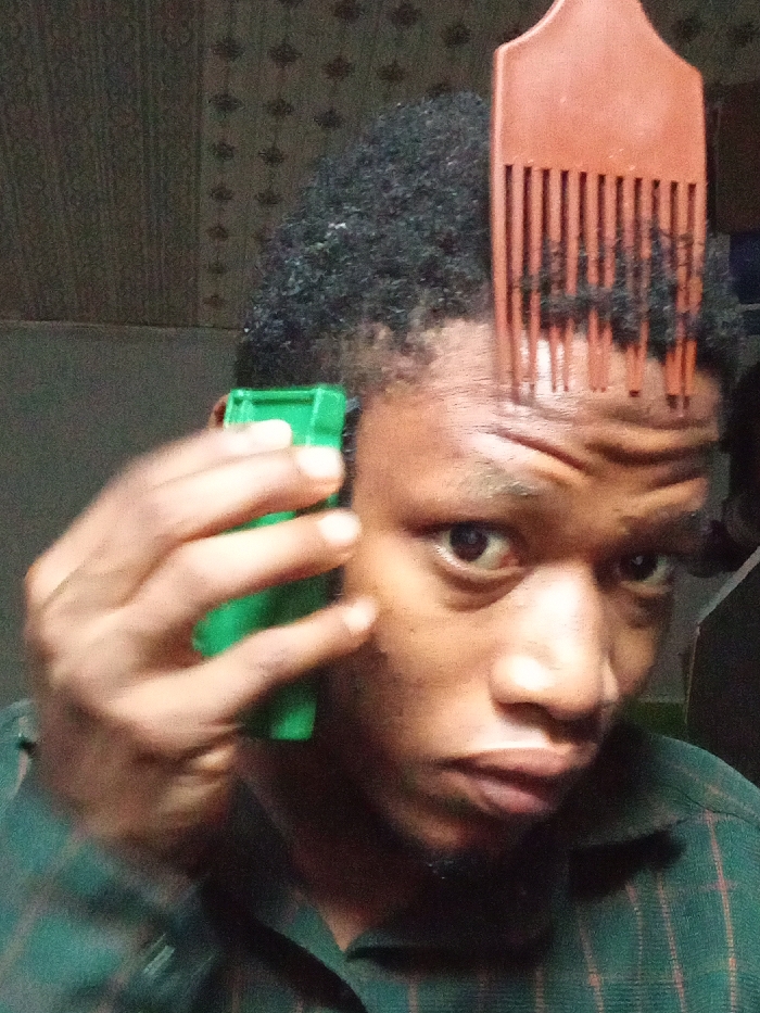 A dark-skinned person is shown from the chest up. They have short, dark, kinky hair and are holding a green hair trimmer in their left hand. A brown hair pick is stuck into the front of their hair. The person is wearing a green plaid shirt. A dark background and wall pattern are partially visible. The photo is taken in a close-up shot.